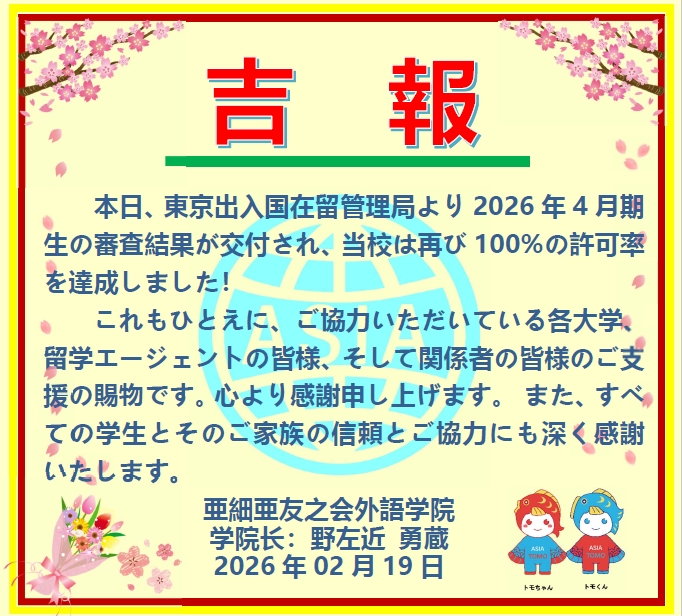「吉報」2026年4月生ー交付率100%