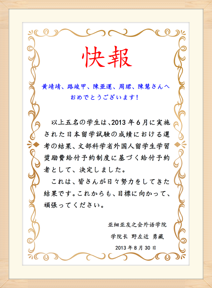 2013/08/30 快報「文部科学省からの予約奨励金通知書」