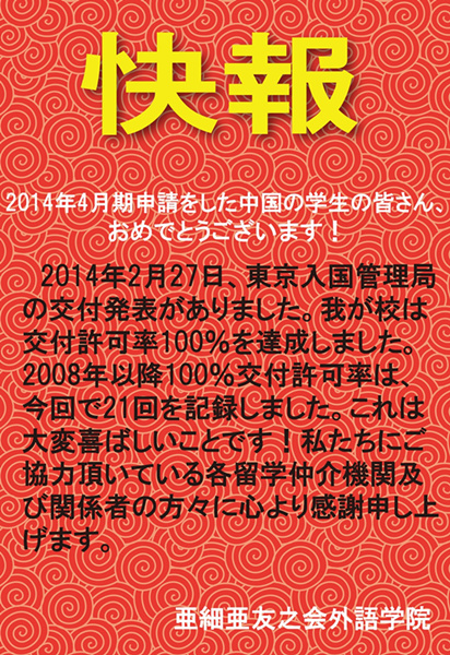 2014/02/27 「快報」2014年1月期生の交付許可率100%達成