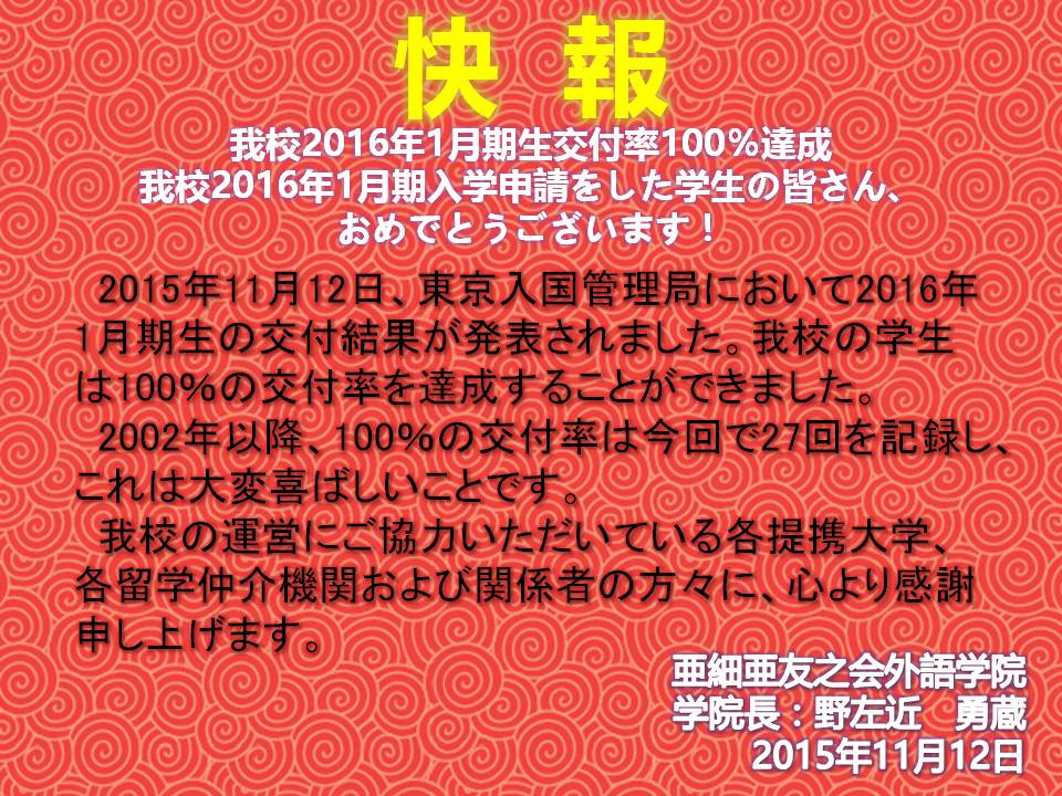 2015/11/12 「快報」2016年1月期生交付許可率100%達成